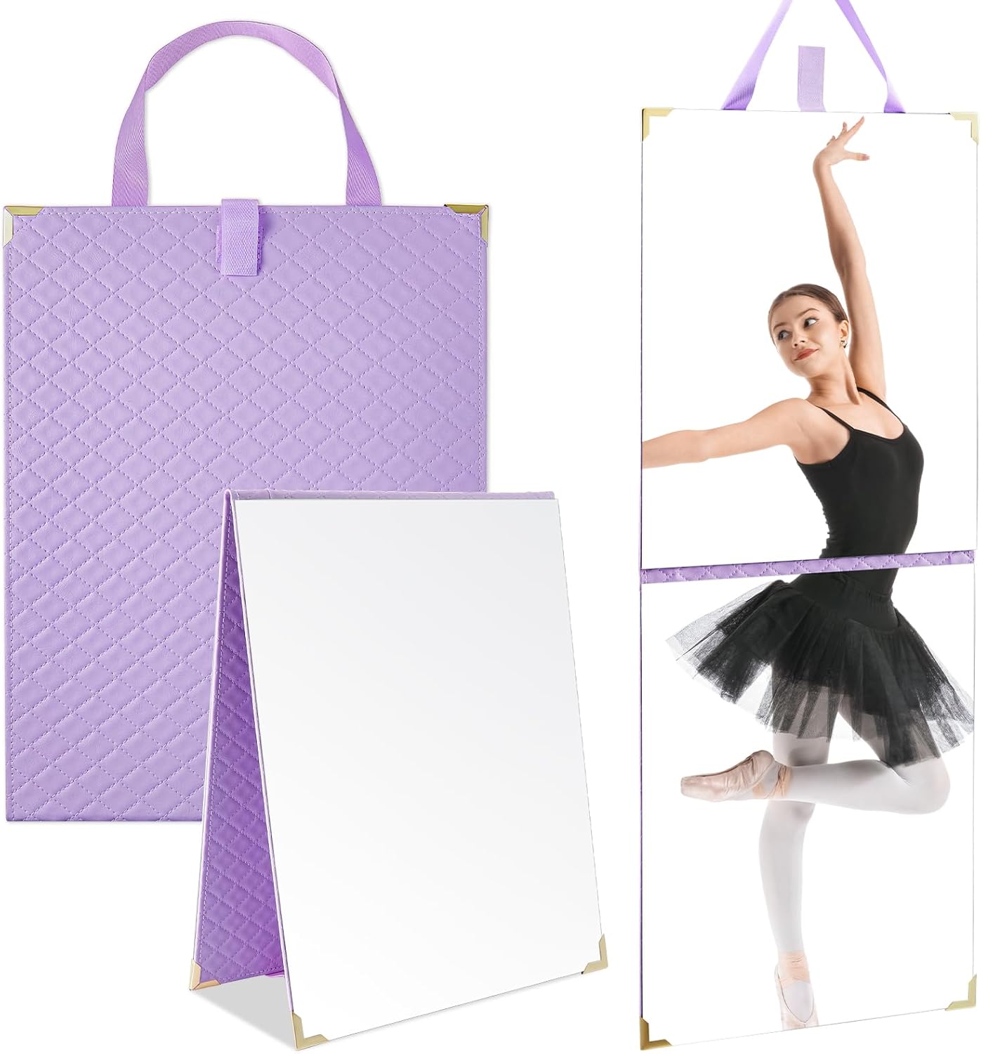 Chunful Frameless Travel Hanging Mirror Leather Foldable Full Length Backstage Makeup Mirror with Handle for Travel Dance Competition Home Fitness Gift(Black,24.61 x 11.22 Inches)