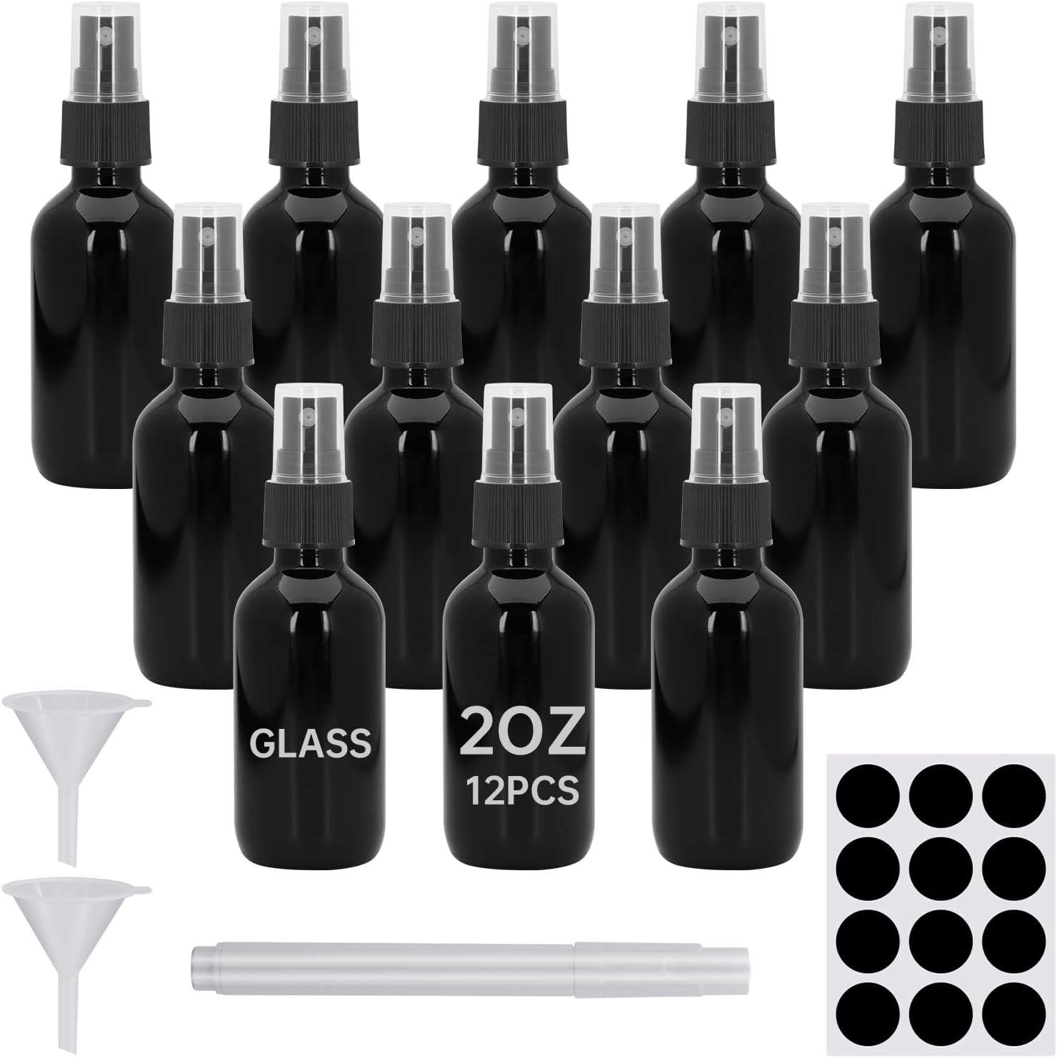 6Pcs Black 2 oz Glass Small Spray Bottles, Reusable Fine Mist Sprayer Small Spray Bottle, Leak-Proof Design, Perfect for Travel, Skin Care, Perfumes, Botanical, Cleansing (6)